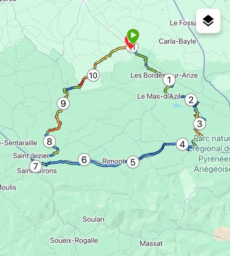 Na Saint-Girons buigt de route weer noordwaarts. Hier wachten nog enkele pittige beklimmingen tot 12%, voordat je via landelijke wegen terugkeert naar Daumazan-sur-Arize en het park.